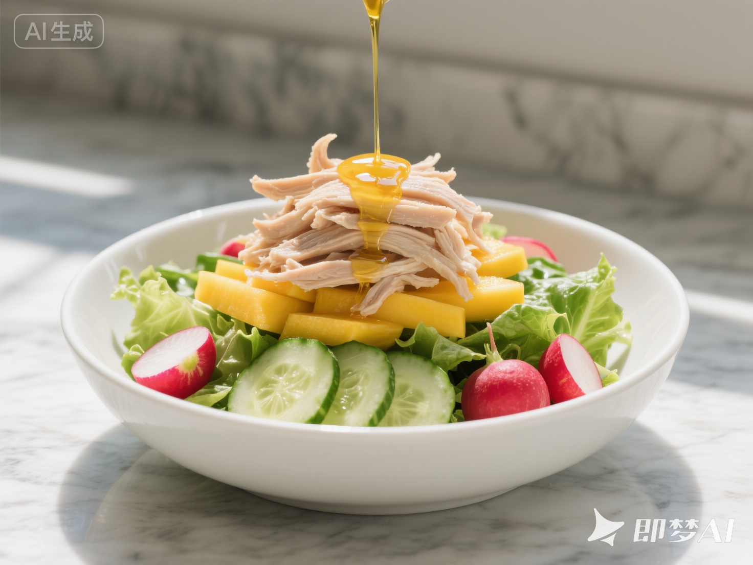 ④ 組合裝盤:將混合生菜鋪在盤底,依次碼上黃瓜片、櫻桃蘿卜片、芒果條,最后撒上撕好的鹽水鴨絲。